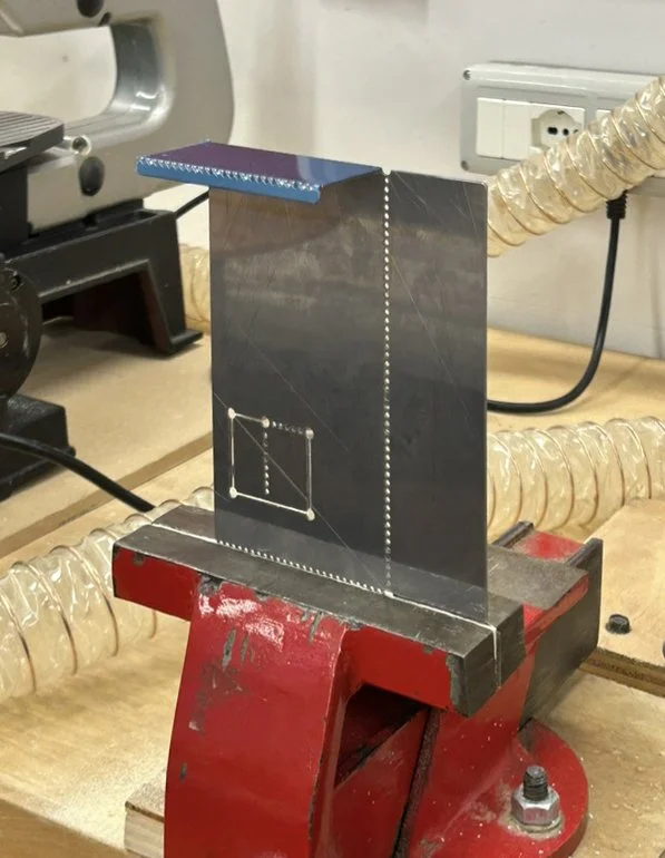 Le perforazioni vengono realizzate con una punzonatrice, una macchina che lavora la lamiera per deformazione plastica. Un punzone – una punta metallica con una determinata geometria – viene premuto contro una matrice producendo un foro netto nel materiale. Il punzone può avere forme diverse: circolare, rettangolare o sagomata. Ripetendo questa azione in sequenza, è possibile costruire linee, pattern o zone di indebolimento estremamente precise. Il progetto nasce dall’osservazione di questo processo.