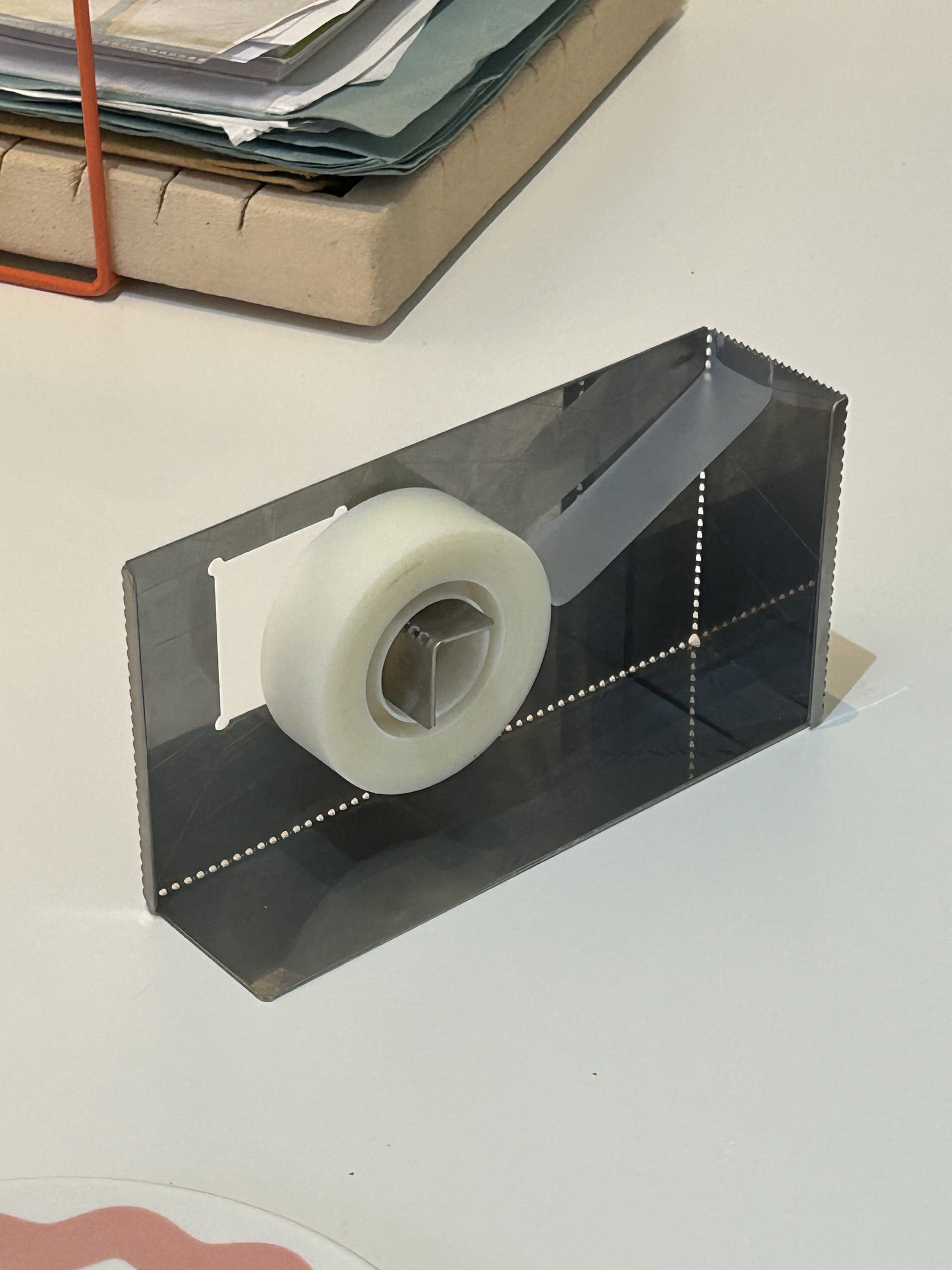 Il risultato è un portascotch ricavato da una singola lastra di acciaio inox da 1 mm di spessore. Le linee di punzonatura definiscono le zone di piega e permettono di modellare l’oggetto direttamente a mano. L’assemblaggio coincide quindi con il completamento del processo di lavorazione.